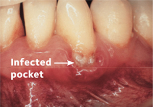 When your gums are healthy, your gum tissues tightly hug each of your teeth. When you have gum disease, your gums pull away from your teeth and may become red, puffy and swollen. Spaces called pockets can form, and these pockets collect more bacteria. If the infected pockets are not treated, the disease will get worse.