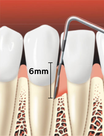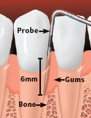 Probe shows pockets due to gum disease. Gums are inflamed and bone loss has occured.