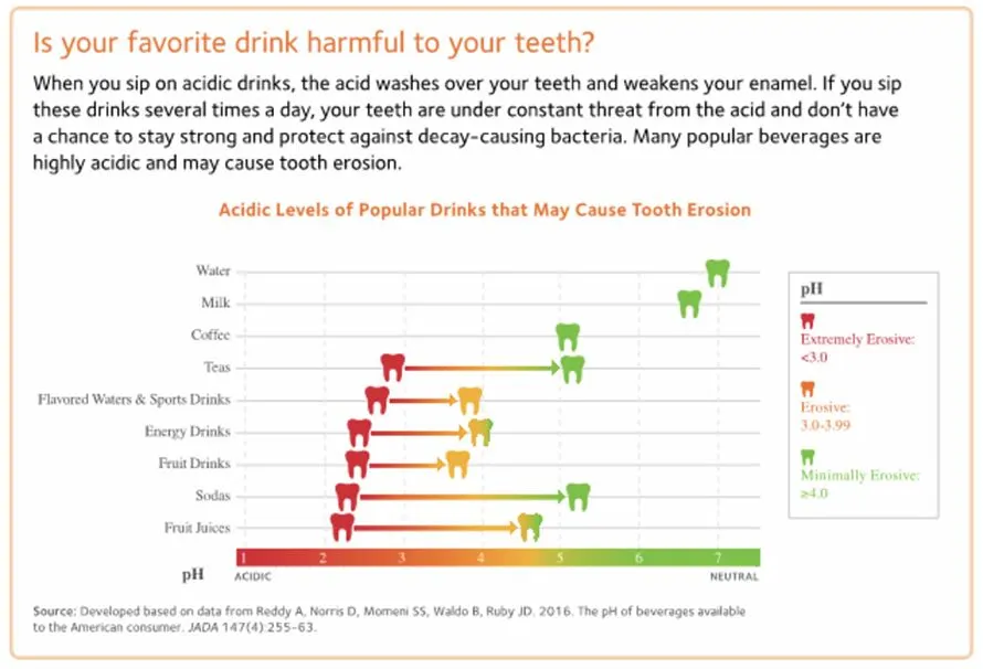 When you sip on acidic drinks, the acid washes over your teeth and weakens your enamel. If you sip these drinks several times a day, your teeth are under constant threat from the acid and don’t have a chance to stay strong and protect against decay-causing bacteria. Many popular beverages are highly acidic and may cause tooth erosion.